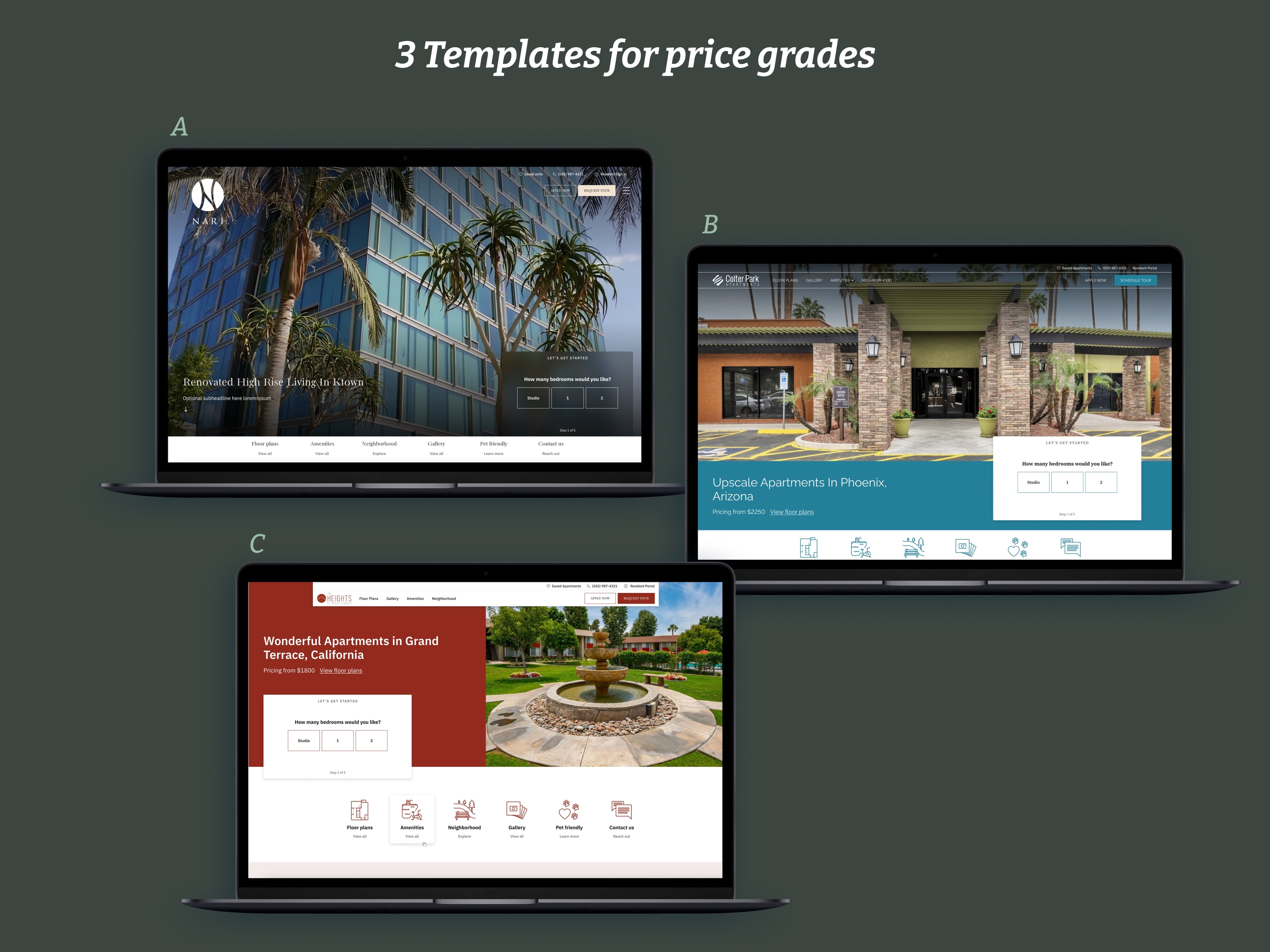 Many of us have been apartment hunting, and it’s common to come across high-end, luxury apartment complexes and other mid-level, economical options to choose from. To help communicate this to the visitor, we’ve designed three different page templates depending on the apartment type.