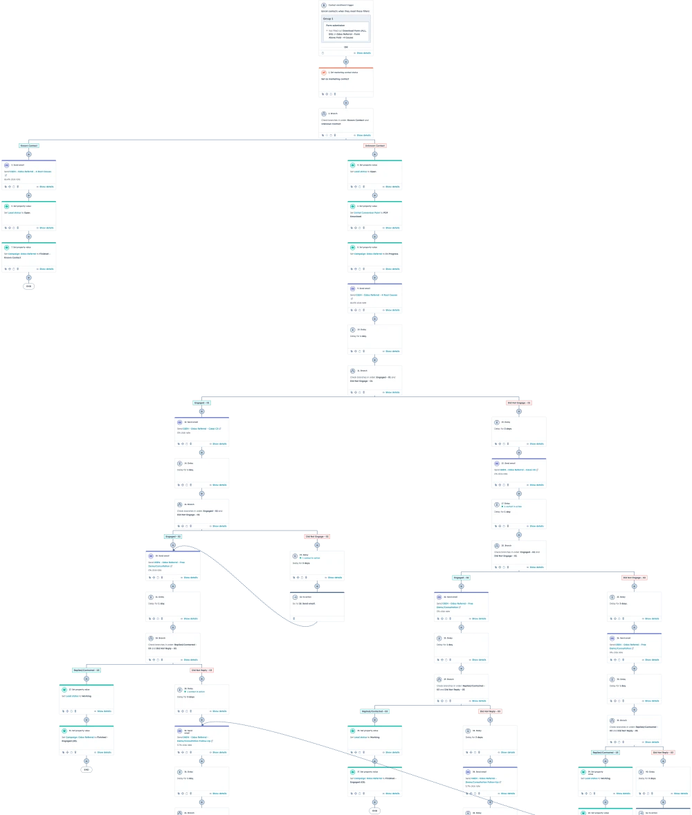 A fairly standard email flow followed. Known contacts received an email chain with calls to action leading to the gated PDF. Whereas the unknown contacts received a more empathetic approach, with separate strategies (or workflows) that are enacted depending on whether the new contact engages with the initial email. For a better understanding, see below: