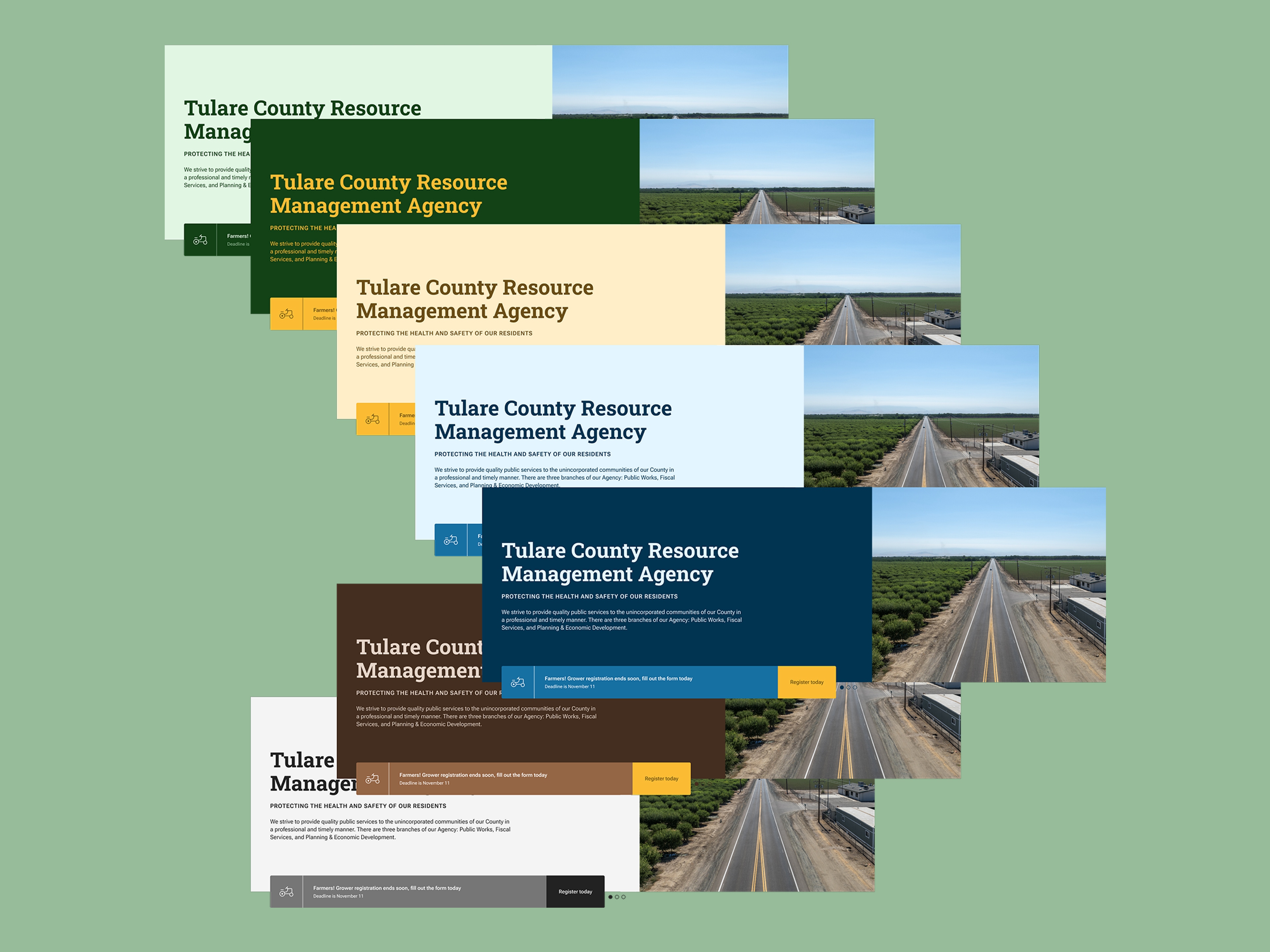 By keeping the Tulare County logo and search bar consistent across all pages, visitors always knew they were on an official site. The 9 page themes, inspired by warm earth tones, reflected the county’s agricultural heritage and created a welcoming, cohesive visual experience. To bring the sites to life, we collaborated with a photographer to capture authentic stock images that highlight Tulare County’s beautiful landscapes, adding a sense of familiarity and genuine local character.